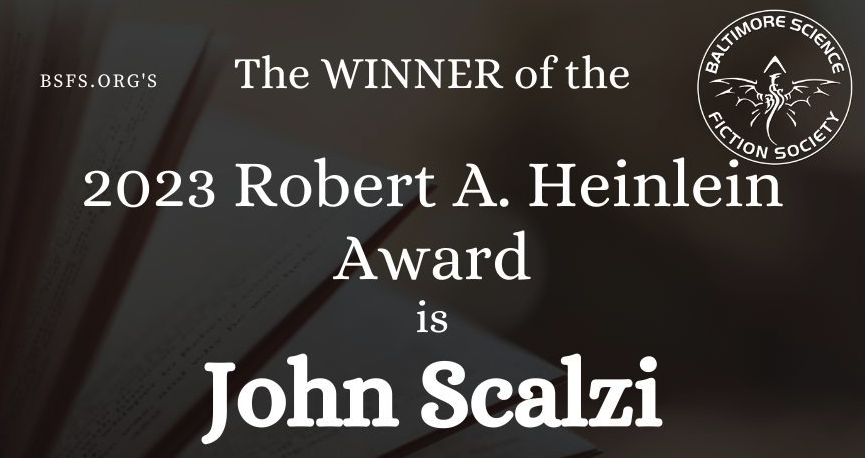 Baltimore Science-fiction Society vient de rendre hommage à John Scalzi en lui remettant le Prix Robert A. Heinlein 2023 pour ses écrits. Notamment pour ses 16 romans, ses nombreuses nouvelles et ses séries comme Le vieil homme et la guerre et L'Interdépendance.