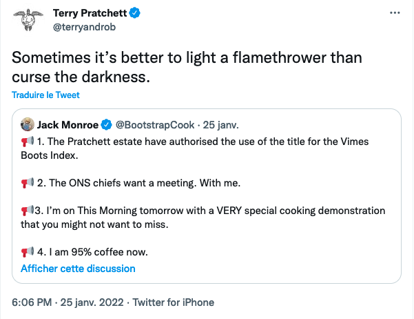 Le 25 janvier dernier, Rhianna Pratchett a autorisé l'utilisation d'un nom lié à l’œuvre de son père pour apporter sa pierre à la lutte contre la pauvreté. Elle a fait en sorte que Jack Monroe, une écrivaine, journaliste et activiste britannique connue pour son engagement dans ce combat, puisse utiliser le terme « Vimes Boots Index ». Il s'agit d'un indice des prix qui suivra « la progression insidieuse des prix des articles essentiels au supermarché ».